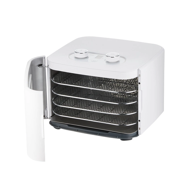 400W mocy w kompaktowej obudowie pracuje cicho – uruchamiasz rano i zostawiasz na cały dzień. Cztery tacki ze stali nierdzewnej o łącznej powierzchni 0,25 m² mieszczą duże porcje wsadu za jednym razem. Stal nie wchodzi w reakcje z żywnością i jest łatwa do czyszczenia po każdym użyciu.